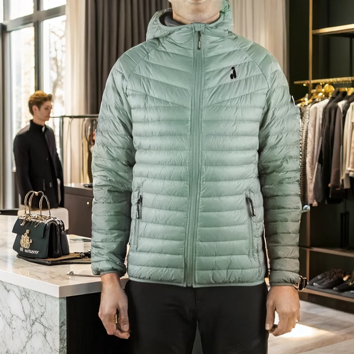 Lightweight green polyester anorak designed for active men. Perfect for outdoor sports and activities requiring weather protection.